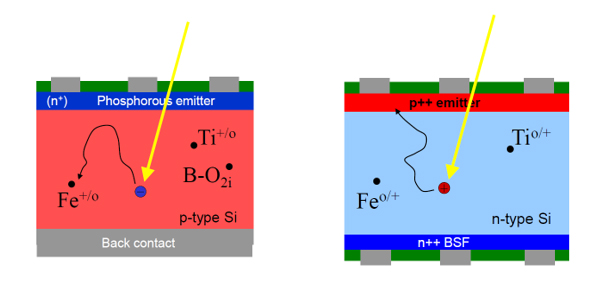 Die meisten Zellen, die heutzutage hergestellt werden, sind p-type Zellen. Der Hauptteil der Zelle ist mit Bor dotiert, während die vordere Fläche mit Phosphor dotiert ist. So wird der P-N-Übergang geschaffen, der die Quelle der elektrischen Leitung ist. Bei einer n-type Zelle ist es umgekehrt. Der Großteil der Zelle ist mit Phosphor, und nur die Oberfläche mit Bor, dotiert. Das Material enthält weniger metallische Verunreinigungen und ist somit "reiner". Außerdem sind n-type Zellen unempfindlicher gegen LID.