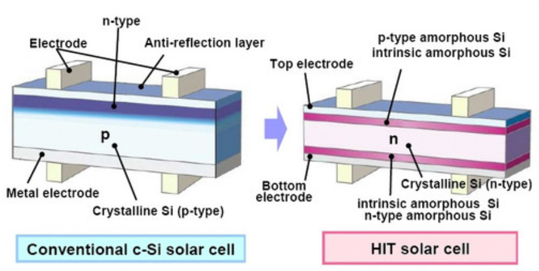Heterojunction is another type of structure of a solar cell. It is a combination of 2 technologies, a base layer of crystalline polysilicon in between 2 layers or amorphous polysilicon. This structure allows to collect more energy out of the solar radiation. As a result the cells have a higher efficiency. Moreover, it has a lower temperature coefficient allowing better performance at high temperature. On top of that, heterojunctions cells are bifacial.